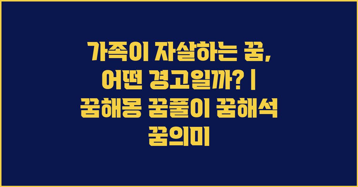 가족이 자살하는 꿈, 슬픈 예감? | 꿈해몽 꿈풀이 꿈해석 꿈의미를 고민할 때, 우리는 보통 최악의 상황을 상상합니다. 그러나 이 꿈이 꼭 나쁜 예감을 의미하는 것은 아닙니다. 전문가들은 이러한 꿈이 실제로 부적응 심리상태를 나타내는 경우가 많다고 이야기합니다. 따라서 이 꿈을 꾼 후, 그 감정이나 불안에 대해 솔직하게 대화하고 해소하는 것이 중요합니다.