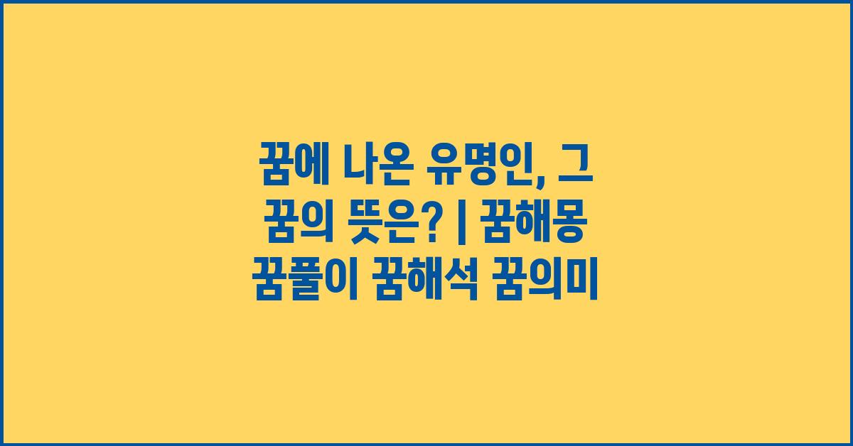 여러분, 꿈에 나온 유명인, 이 꿈은 무엇을 의미할까? | 꿈해몽 꿈풀이 꿈해석 꿈의미를 통해 여러분의 꿈을 해석해 보세요. 꿈은 우리가 생각지 못했던 마음의 깊이를 드러내며, 자신을 이해하는 중요한 도구가 될 수 있습니다. 꿈에서 느꼈던 감정, 나와의 대화, 그리고 그것이 나에게 던지는 메시지를 충분히 느껴보십시오. 이 과정을 통해 진정한 나를 알게 되길 바랍니다.