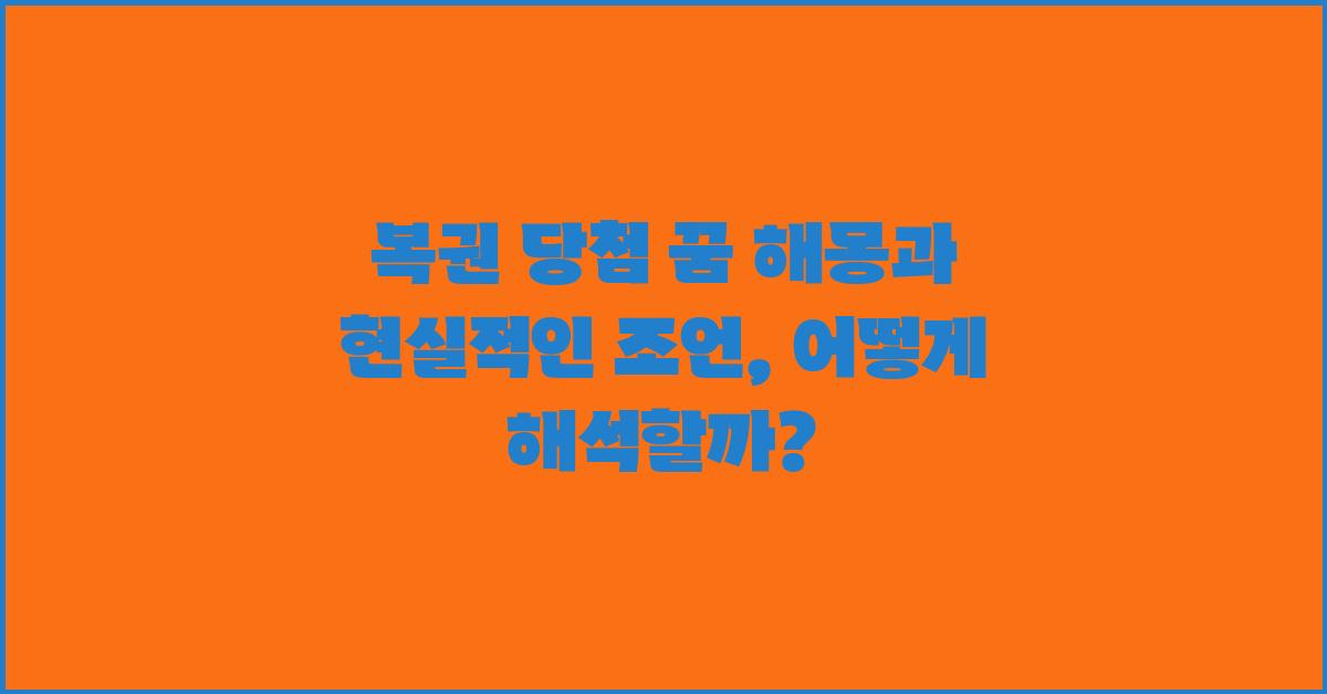 그러나 이런 긍정적인 해석이 항상 진실한 것은 아닙니다. 복권 당첨 꿈 해몽과 현실적인 조언 | 꿈해몽 꿈풀이 꿈해석 꿈의미를 통해 여러분이 꼭 기억해야 할 점은 꿈이 현실과 연결될 필요는 없다는 것입니다. 때로는 그저 꿈일 뿐이라는 깨달음도 중요하지요. 꿈을 통해 우리가 얻어야 할 것은 단순한 행운이 아닌, 우리의 현재 상태와 내면의 갈등을 드러낼 수 있는 기회라는 점입니다.