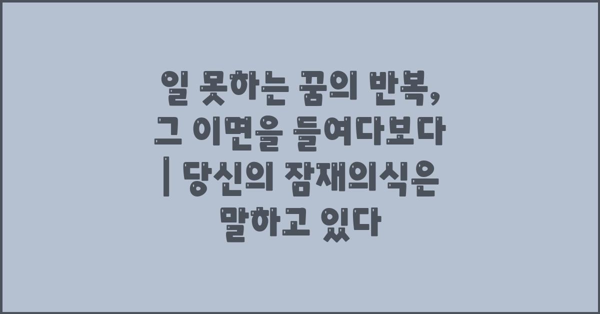 꿈은 많은 경우 우리가 어딘가에서 느끼는 감정과 매우 밀접한 연관을 가지고 있습니다. 특히 '일 못하는 꿈의 반복, 그 이면을 들여다보다 | 꿈해몽 꿈풀이 꿈해석 꿈의미'와 같은 주제는 사람들의 주요 관심사입니다. 이러한 꿈들은 때로는 우리의 두려움이나 불안이 드러나는 창구가 되곤 하죠. 아마 여러분은 그 꿈 속에서 무기력함이나 불안감을 느끼셨을 것입니다. 과거의 경험들이 추억의 그림자처럼 우리를 괴롭히는 것과도 같습니다.