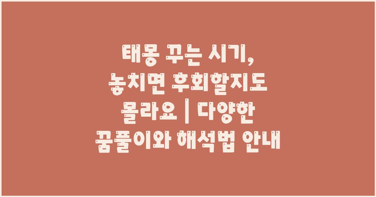 태몽의 해석은 꿈속의 상황과 상징에 따라 다르게 접근할 수 있습니다. 예를 들어, 아기가 환하게 웃고 있는 꿈은 가족에게 행복이 찾아올 것이라는 신호로 해석될 수 있습니다. 반면에, 아기가 아프거나 울고 있는 꿈은 불안한 예감일 수도 있습니다. 이런 다양한 해석들을 통해 태몽 꾸는 시기, 놓치면 후회할지도 몰라요! 여러분의 마음속 깊은 곳에 숨겨진 감정을 끌어낼 수 있습니다.
